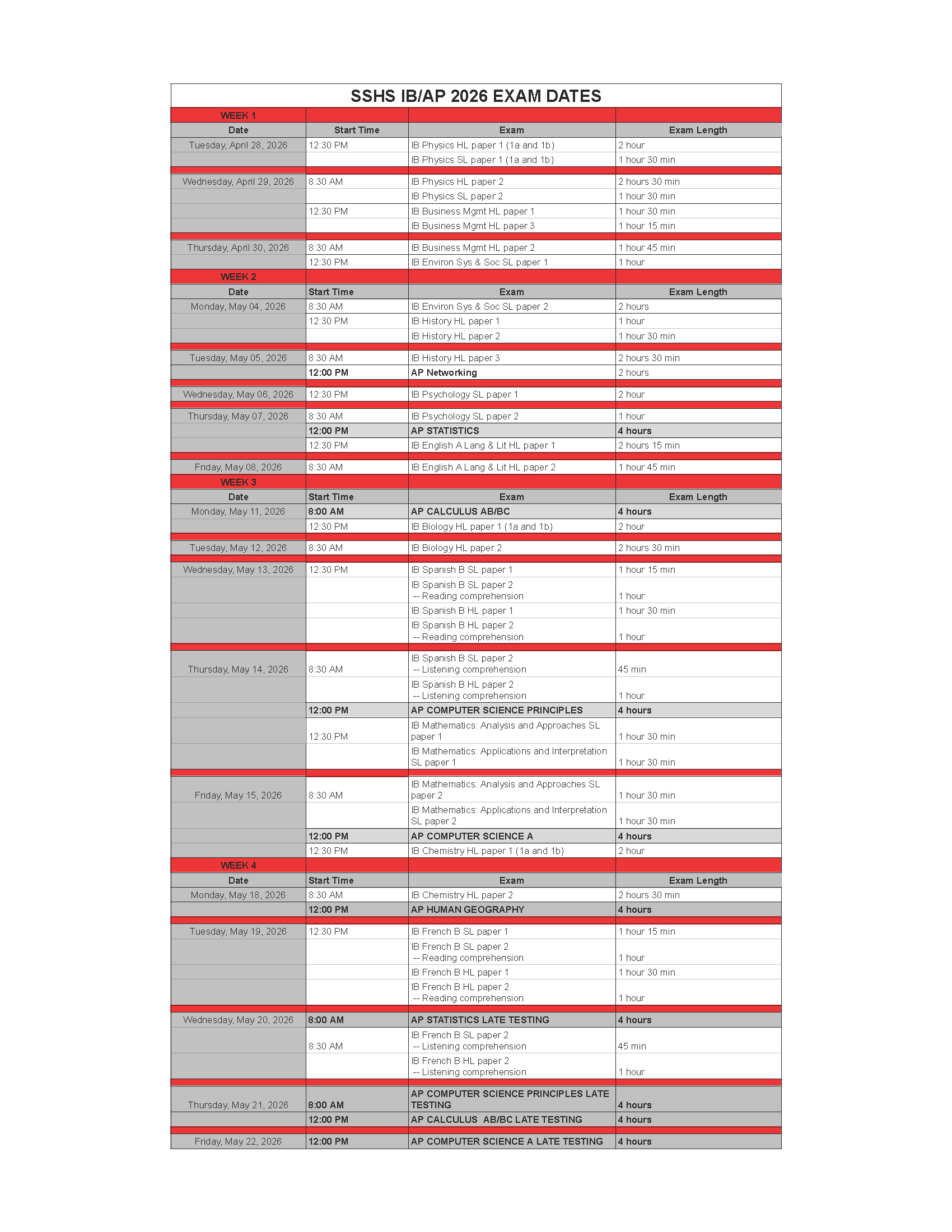Dear South Side High School Community,Attached please find the exam schedule for this year’s IB and AP exams.Please note that students MUST arrive 30 minutes before the exam time indicated so the t...